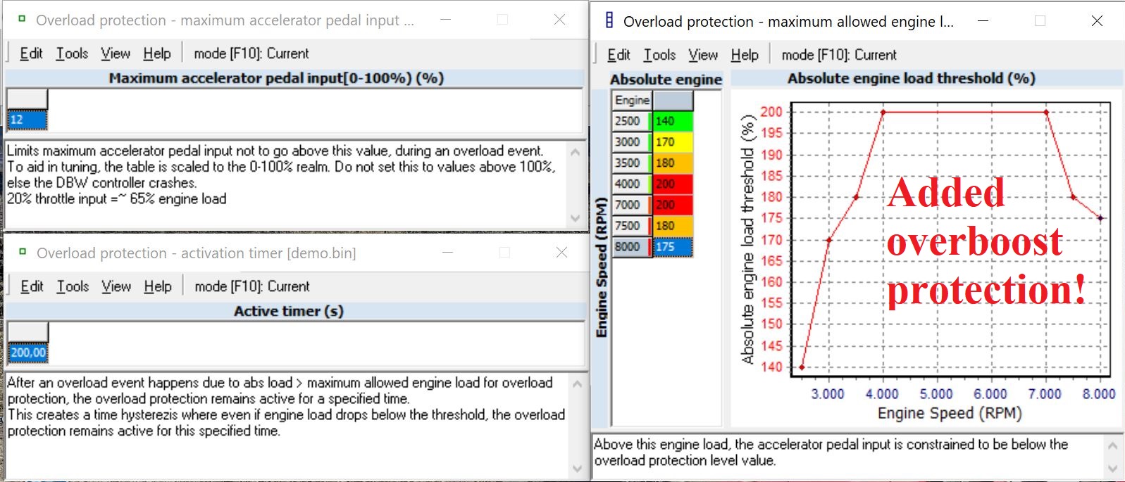 - If boost exceeds limits, adjustable by RPM: engine power is cut for a defined time(seconds); long enough for turbo spool-down; and for it to be clearly noticeable to the driver